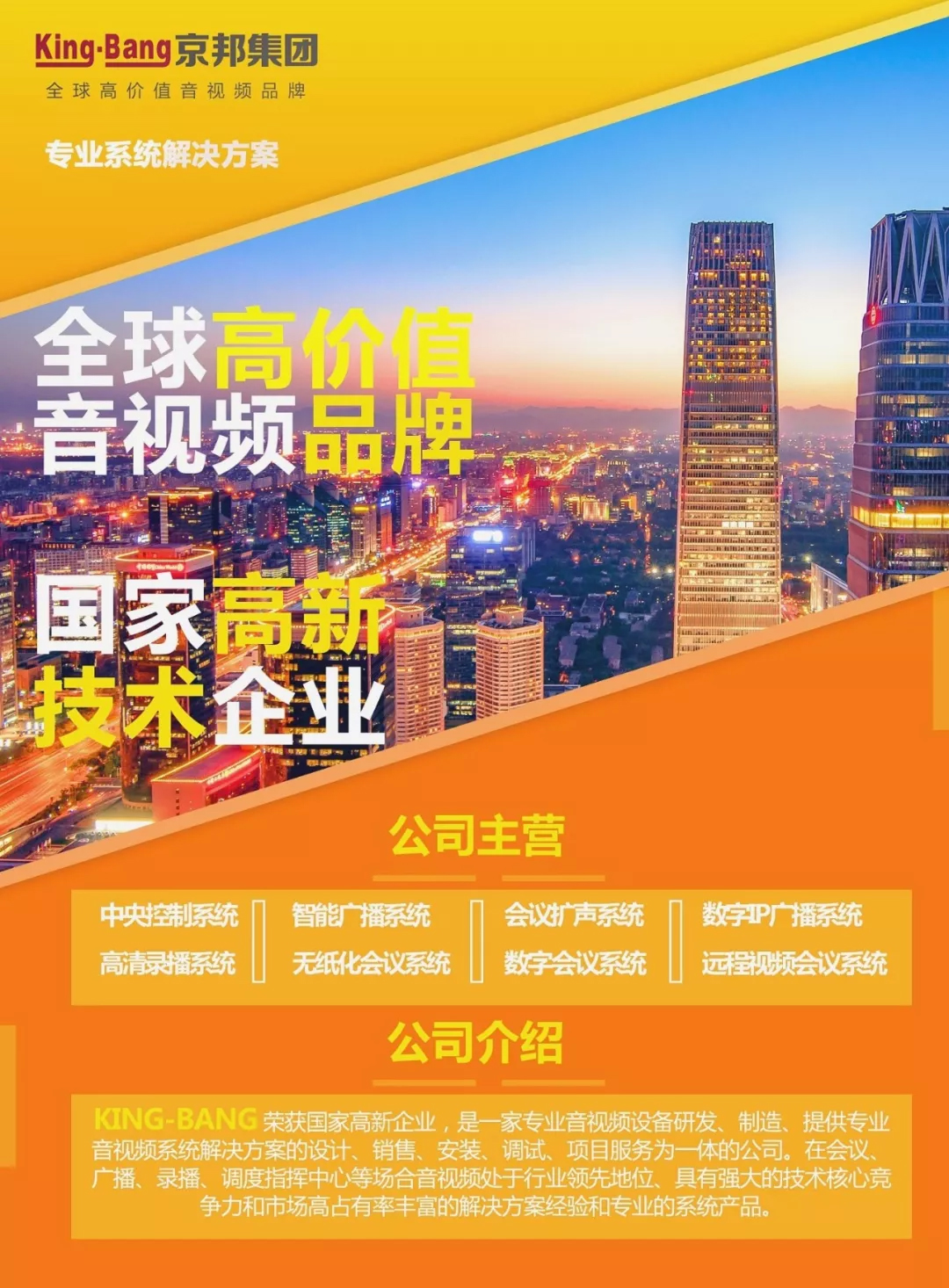 京邦電子(KING-BANG)做為全球高價值的音視頻品牌,連續(xù)五年(2014、2015、2016、2017、2018)被評為十大公共廣播品牌、十大會議系統(tǒng)品牌,榮獲國家高新技術(shù)企業(yè),被中國質(zhì)量協(xié)會評為全國音響行業(yè)質(zhì)量領(lǐng)先品牌、全國質(zhì)量誠信標(biāo)桿典型企業(yè)、全國質(zhì)量檢驗穩(wěn)定合格產(chǎn)品,并產(chǎn)品成功應(yīng)用于2008年北京奧運會、2010年廣州亞運會、三峽大壩等國家級重點工程,全國成功案例突破十萬個。
