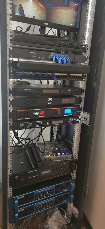 放大設備——指對經(jīng)過調(diào)控設備混音輸出、信號處理后的信號進行后級功率放大設備,這里指專業(yè)功率放大器;重放設備——指將經(jīng)過后級功率放大器放大的音頻信號進行電—聲轉換并釋放表現(xiàn)出來人耳可懂的聲頻信號的設備,這里指揚聲器;